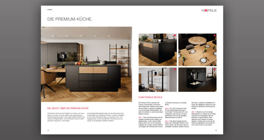 Die Küchenmotive in dieser Broschüre wurden am Computer mit Hilfe von 3D-Software durch das Grafikhelden Design Studio in Herrenberg erstellt und gerendert. Sie sind ein wichtiger Bestandteil für das Küchenmagazin. Häfele selbst setzt stark auf 3D-Darstellungen. Vorteil – Blenden und Schubladensysteme, als auch unterschiedliche Beleuchtungssituationen, lassen sich bei Notwendigkeit schnell anpassen.